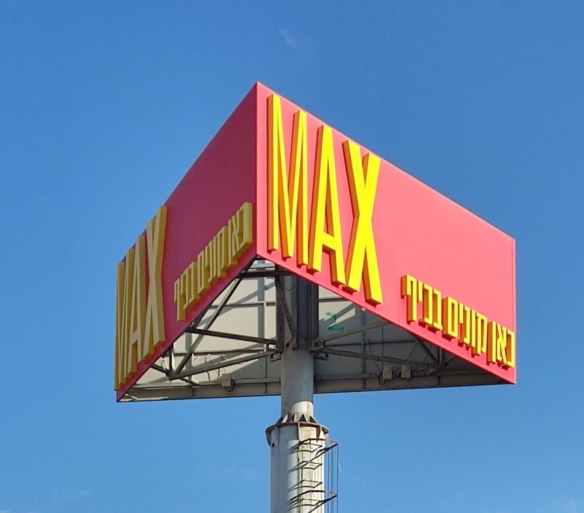 "פרויקט בפריסה ארצית למיתוג חנויות MAX. כולל שילוט חיצוני ופנימי. שילוט מואר, שילוט בנוי, קונסטרוקטיות והדפסות דיגיטליות ע""ג חומרים שונים. מיתוג פני החנויות כולל קירות ועמודים."